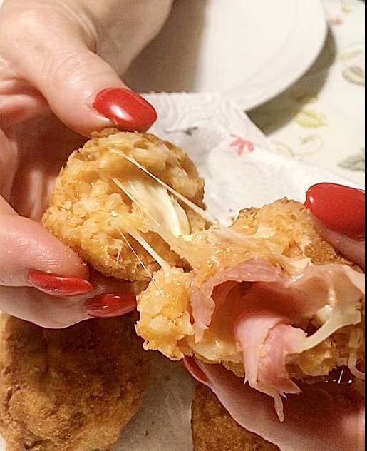 - sul palmo della mano formare gli arancini aggiungendo al centro il prosciutto cotto e il formaggio ( chiudere a forma sferica )