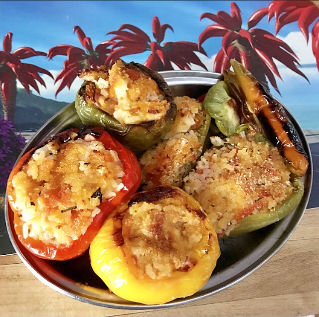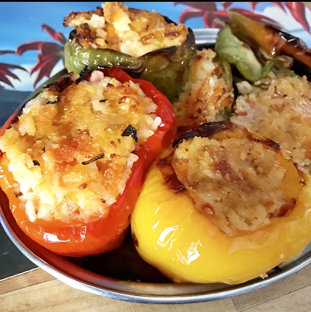 - riempire i peperoni ( svuotati dai semi) con il riso condito e aggiungendo il prosciutto cotto e tocchetti di mozzarella fior di latte