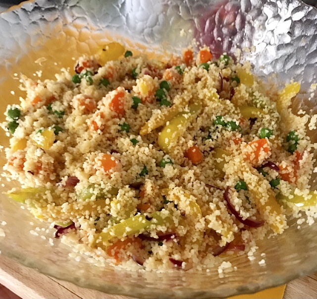 Couscous secco ( si trova facilmente al supermercato) e fatto rinvenire a bagno con brodo vegetale tiepido + l’aggiunta di 1 cucchiaio di olio extravergine d’oliva! Si lascia rinvenire per circa 30 minuti ( chiuso con pellicola x alimenti) e poi si sgretola con i lembi di una forchetta fin a raggiungere i granelli staccati !