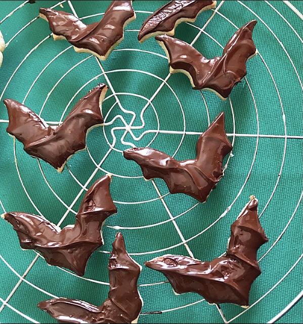 Continuare sciogliendo a bagnomaria il cioccolato fondente 100gr e intingere i pipistrelli 🦇, il ciuffo degli zombi e occhi e bocca per zucche 🎃 e fantasmini 👻