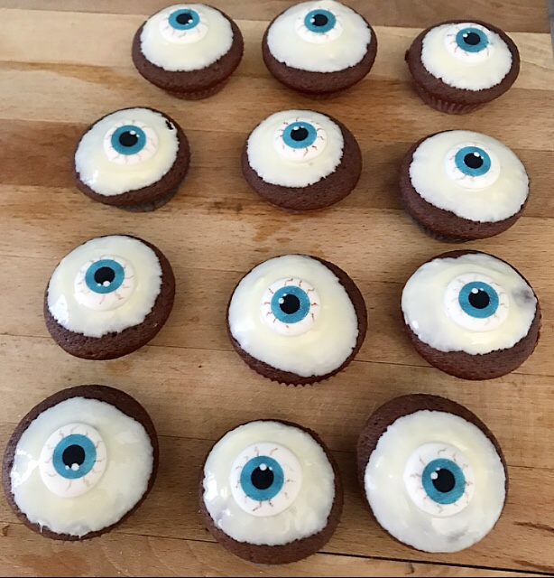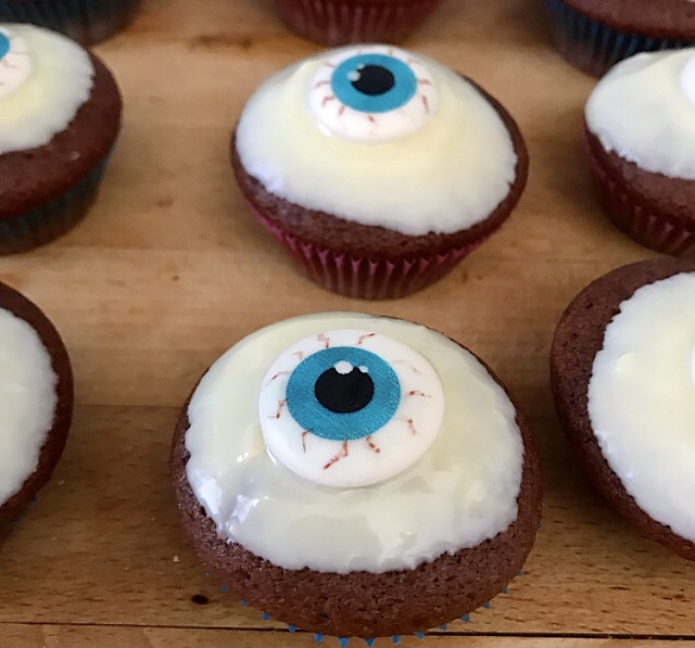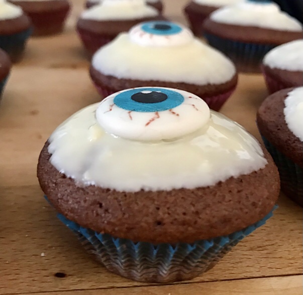 Sbattere l’uovo con lo zucchero, un pizzico di sale e la scorza grattugiata di mezza arancia , finché raddoppia di volume. Poi aggiungere all’impasto l’olio di semi + il latte + la farina , il lievito e il cacao amaro setacciati ! Riempire le cartine lasciando un po’ di spazio dall’orlo ! Forno preriscaldato 180”x 15 minuti! Fare intiepidire i Muffin e poi intingerli nel cioccolato bianco sciolto a bagnomaria aggiungere al centro un occhio 👁 in pasta di zucchero!